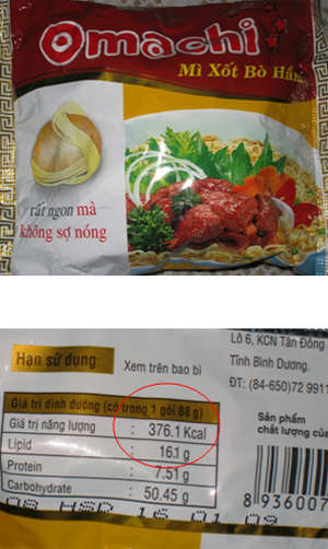 Ví dụ 2: một gói mì ăn liền tương đương 1 chén cơm có năng lượng 376,1kcal