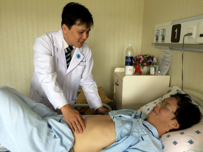 | Bác sĩ Trần Công Duy Long khám cho ông H.T.T. bị ung thư gan sáng 6-7 - Ảnh: L.TH.H. |