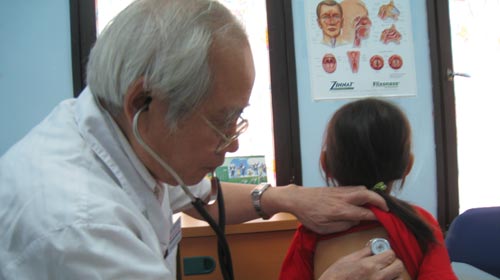 | Bác sĩ phòng khám tự nguyện Bệnh viện Nhi trung ương khám cho bệnh nhi hen phế quản - Ảnh: N.Hà |