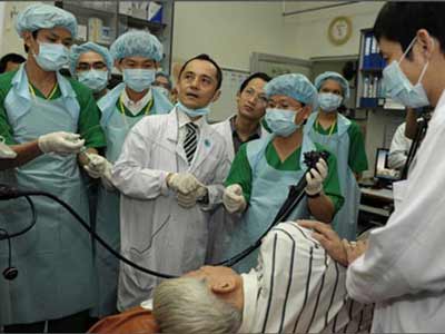 | BS Mori (Nhật) đang hướng dẫn các bác sĩ Việt Nam phương pháp nội soi mới |