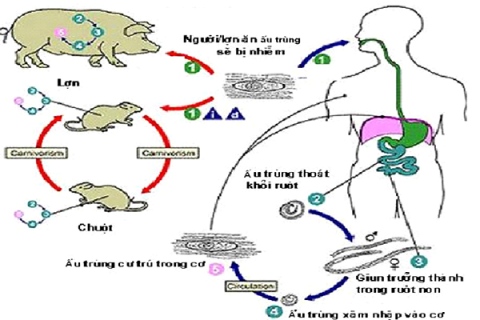 Nếu con người ăn thịt các động vật này mang ấu trùng thì người sẽ bị nhiễm bệnh giun xoắn. Giun trưởng thành ký sinh ở ruột. Giun xoắn đơn giới, con đực dài 1,2 - 1,5mm, con cái dài 2,2 - 3mm. Con cái đẻ tới 550 - 1.500 ấu trùng trong 4 - 6 tuần. Ấu trùng kích thước 0,1mm đi vào hệ bạch huyết và máu để tới các cơ của cơ thể vật chủ, chủ yếu là cơ hoành, cơ xương, cơ tim. Trong cơ, ấu trùng giun xoắn có kích thước 0,8 - 1mm, chúng cuộn tròn thành kén 0,5 x 0,25mm, mỗi kén thường có 1 con. Sự tạo kén trong cơ của ấu trùng trong vòng 2 tháng và bắt đầu bị canxi hoá từ 6 - 9 tháng. Có ấu trùng tồn tại trong cơ vài năm và thậm chí tới 25 - 30 năm. Nếu không được điều trị kịp thời, bệnh nhân có thể tử vong.